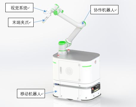 复合机器人由协作机器人和移动机器人组成。采用360°对角双激光 SLAM 导航+惯性导航技术,同时还配置了视觉系统、末端夹爪和相应的软件。